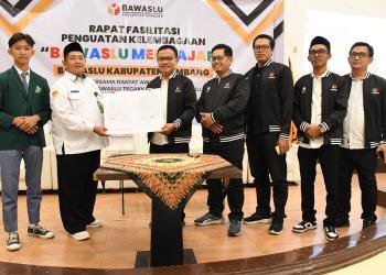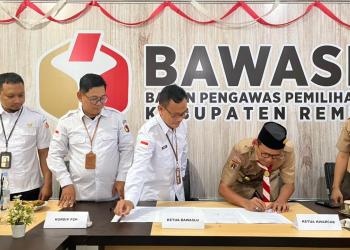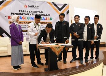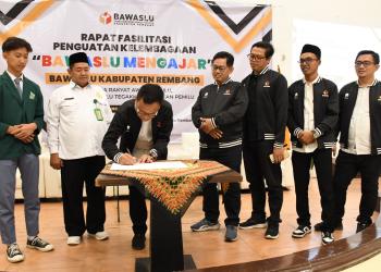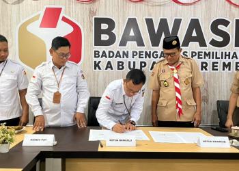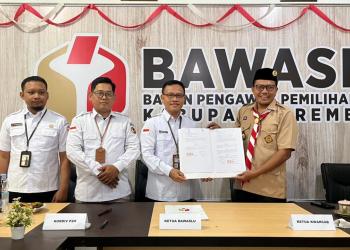 Sinergi Bawaslu Kabupaten Rembang dan Kwarcab Gerakan Pramuka Kabupaten Rembang ditandai dengan penandatanganan MoU