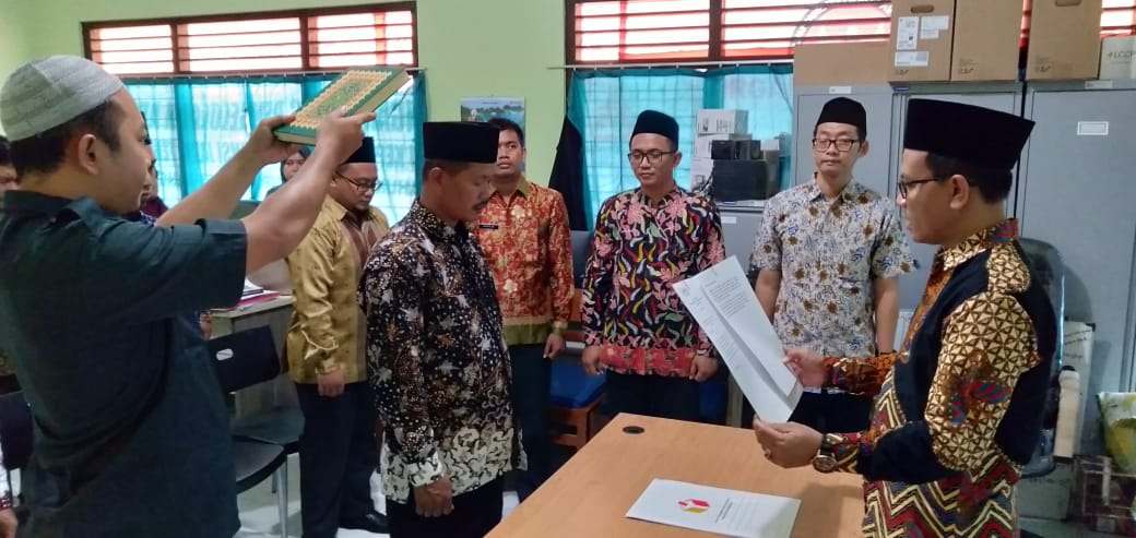 Proses pengambilan sumpah jabatan dan pelantikan Masduki sebagai anggota Panwaslu Kecamatan Pamotan dilakukan di Kantor Bawaslu Kabupaten Rembang, Selasa (8/11). Proses pelantikan dihadiri oleh seluruh Komisoner Bawaslu Rembang serta anggota Panwaslu Kecamatan lainnya. Masduki dilantik berdasarkan SK Bawaslu Jateng Nomor 5/K.BAWASLU PROV.JT/HK.01.01/I/2019